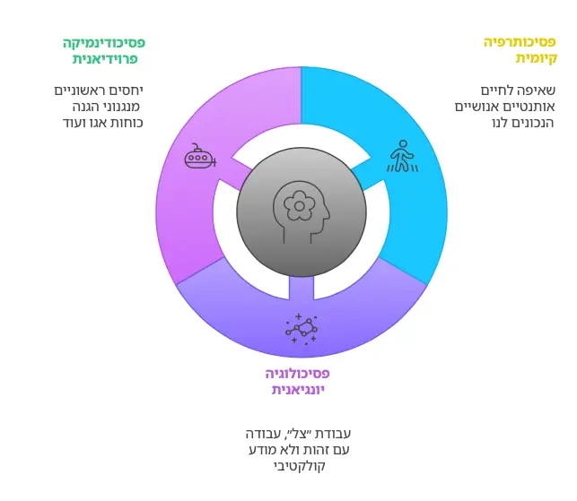 • פסיכודינמיקה פרוידיאנית: חקירה של יחסים ראשוניים כדי להבין כיצד חוויות העבר מעצבות את ההתנהגות בהווה וזיהוי מנגנוני הגנה ועבודה איתם תוך כדי עבודה לקראת ייצור כוחות אגו מיטיביים.