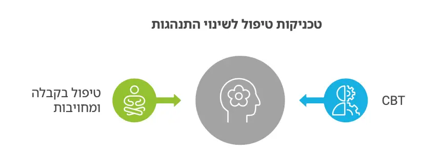 • טיפול קוגניטיבי-התנהגותי (CBT) :זיהוי עיוותים קוגניטיביים, כגון חשיבה בשחור-לבן, ועבודה לשנותם. שימוש בהפעלה התנהגותית כדי לעודד פעולות חיוביות שמובילות לשיפור במצב הרוח ולהפחתת הימנעות ממתח ומחוסר נוחות.